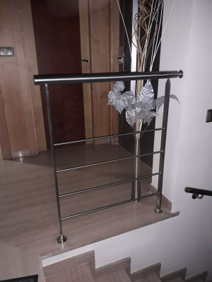 Barandilla de acero inoxidable AISI 304 de 100 cm de altura, compuesta de pasamanos de 50 mm de diámetro sujeto a montantes verticales de 40x40 mm dispuestos cada 120 cm y entrepaño de 3 barrotes macizos horizontales de 12 mm de diámetro soldados a los montantes, para hueco poligonal de losa. Incluso pletinas para fijación mediante atornillado en obra de mampostería con tacos de nylon y tornillos de acero. Elaborada en taller y montada en obra.